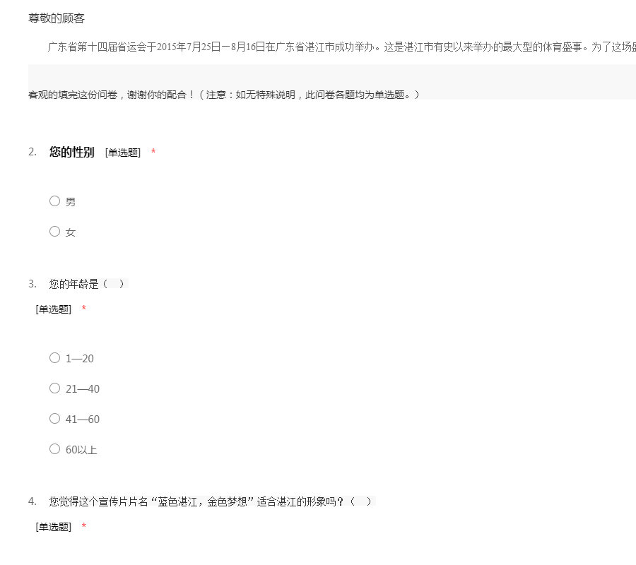 广东省第十四届省运会于2015年7月25日—8月16日在广东省湛江市成功举办。这是湛江市有史以来举办的最大型的体育盛事。为了这场盛事的成功举办,湛江市对此发布了第十四届广东省运动会电视宣传片《蓝色湛江,金色梦想》,并在公交车上反复播放。但是这个宣传片是否让人真实地领略湛江的魅力,印象深刻?您对此又有什么建议呢?请您认真、客观的填完这份问卷,谢谢你的配合!(注意:如无特殊说明,此问卷各题均为单选题。)