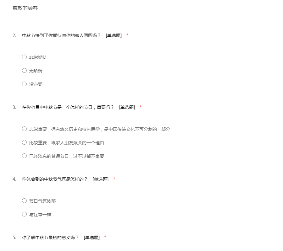 您好! 首先, 感谢您在百忙之中协助我们此次的调查。 本次调查目的在于了 解当下人们年对中秋节的认识与看法。耽误您宝贵的时间,再次向你致谢!