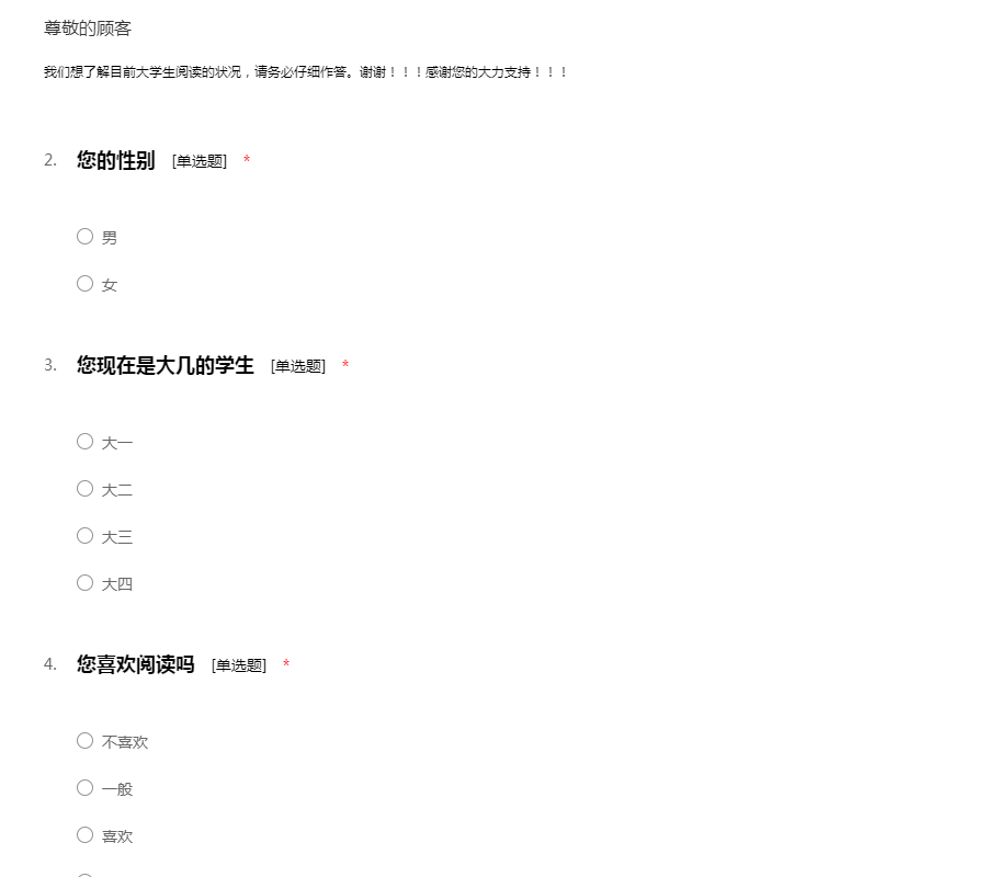 我们想了解目前大学生阅读的状况,请务必仔细作答。谢谢!!!感谢您的大力支持!!!