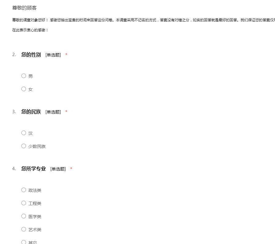尊敬的调查对象您好! 感谢您抽出宝贵的时间来回答这份问卷。本调查采用不记名的方式,答案没有对错之分,如实的回答就是最好的回答。我们保证您的答案仅用于学术研究,不会影响到您的个人利害关系。在此表示衷心的感谢!
