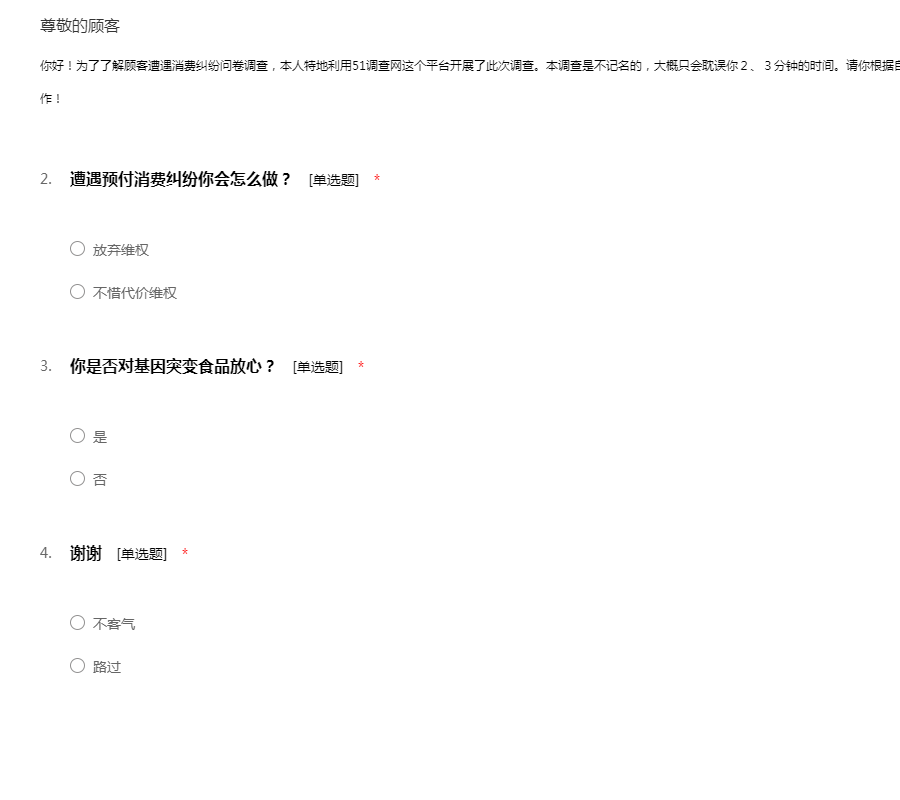 你好!为了了解顾客遭遇消费纠纷问卷调查,本人特地利用51调查网这个平台开展了此次调查。本调查是不记名的,大概只会耽误你2、3分钟的时间。请你根据自己的实际情况填写。衷心感谢你的支持与合作!