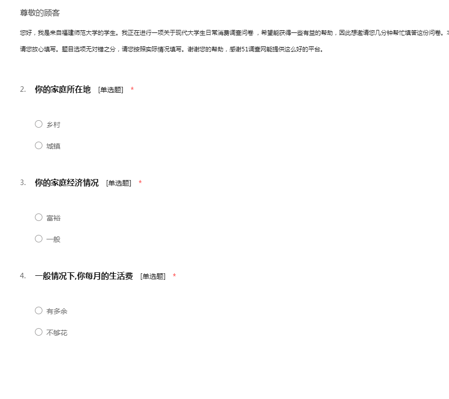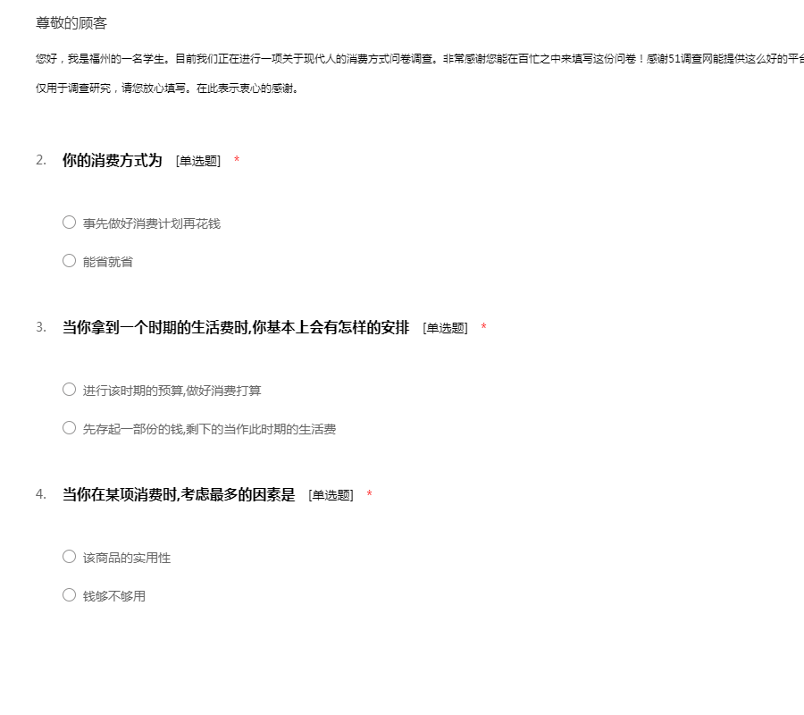 您好,我是福州的一名学生。目前我们正在进行一项关于现代人的消费方式问卷调查。非常感谢您能在百忙之中来填写这份问卷!感谢51调查网能提供这么好的平台,本调查会保证您的个人信息不被泄露,而仅仅用于调查研究,请您放心填写。在此表示衷心的感谢。