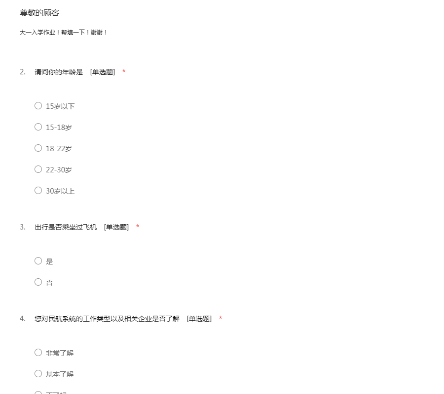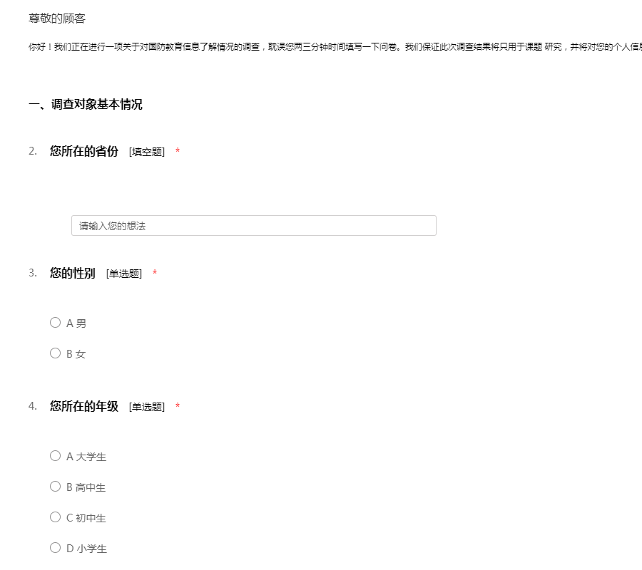 你好!我们正在进行一项关于对国防教育信息了解情况的调查,耽误您两三分钟时间填写一下问卷。我们保证此次调查结果将只用于课题 研究,并将对您的个人信息完全保密,非常感谢您对我们工作的支持!