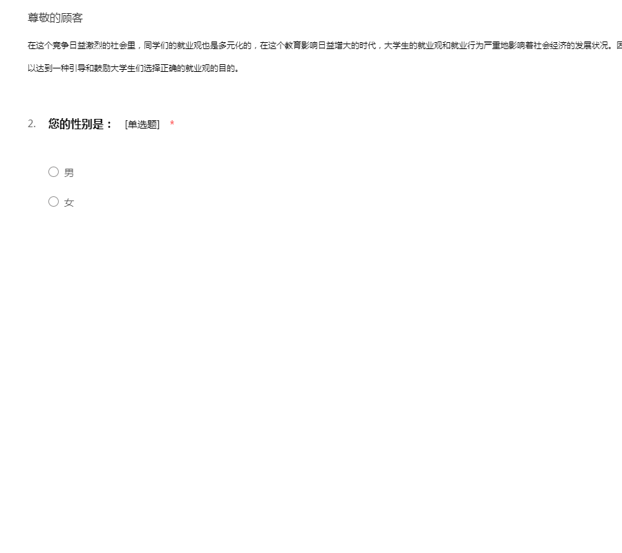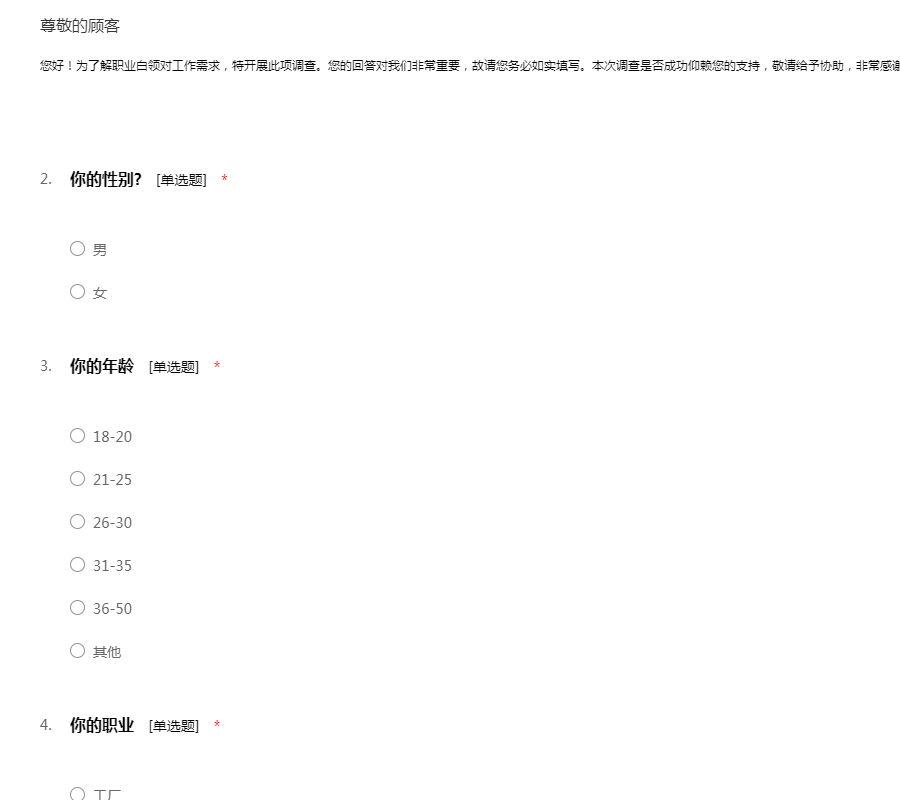 您好!为了解职业白领对工作需求,特开展此项调查。您的回答对我们非常重要,故请您务必如实填写。本次调查是否成功仰赖您的支持,敬请给予协助,非常感谢!祝万事如意!