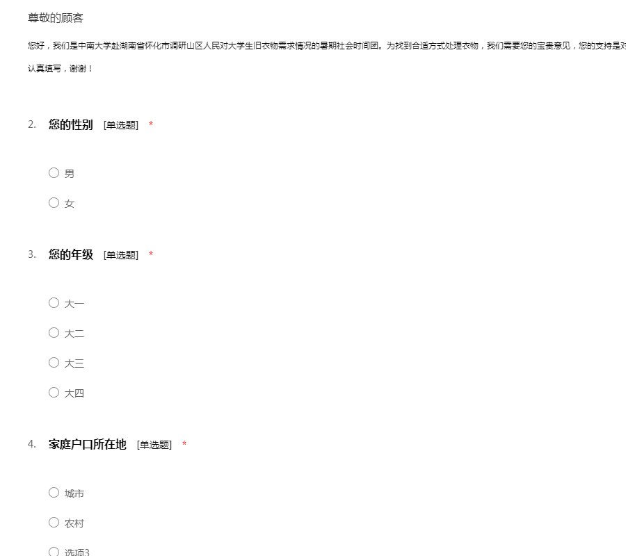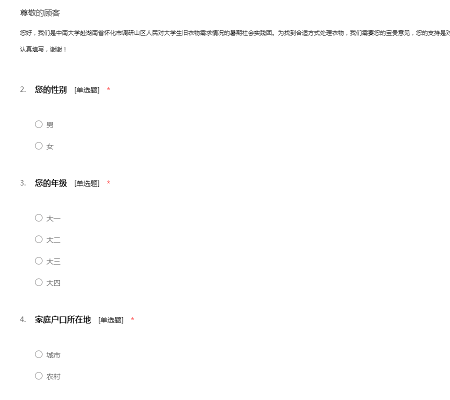 您好,我们是中南大学赴湖南省怀化市调研山区人民对大学生旧衣物需求情况的暑期社会实践团。为找到合适方式处理衣物,我们需要您的宝贵意见,您的支持是对我们最大的鼓励。您的意见对我们非常重要,请认真填写,谢谢!