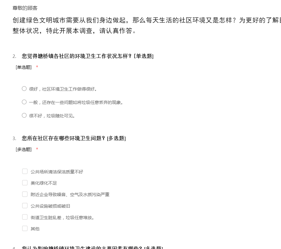 创建绿色文明城市需要从我们身边做起,那么每天生活的社区环境又是怎样?为更好的了解目前塘桥镇各社区环境卫生整体状况,特此开展本调查,请认真作答。