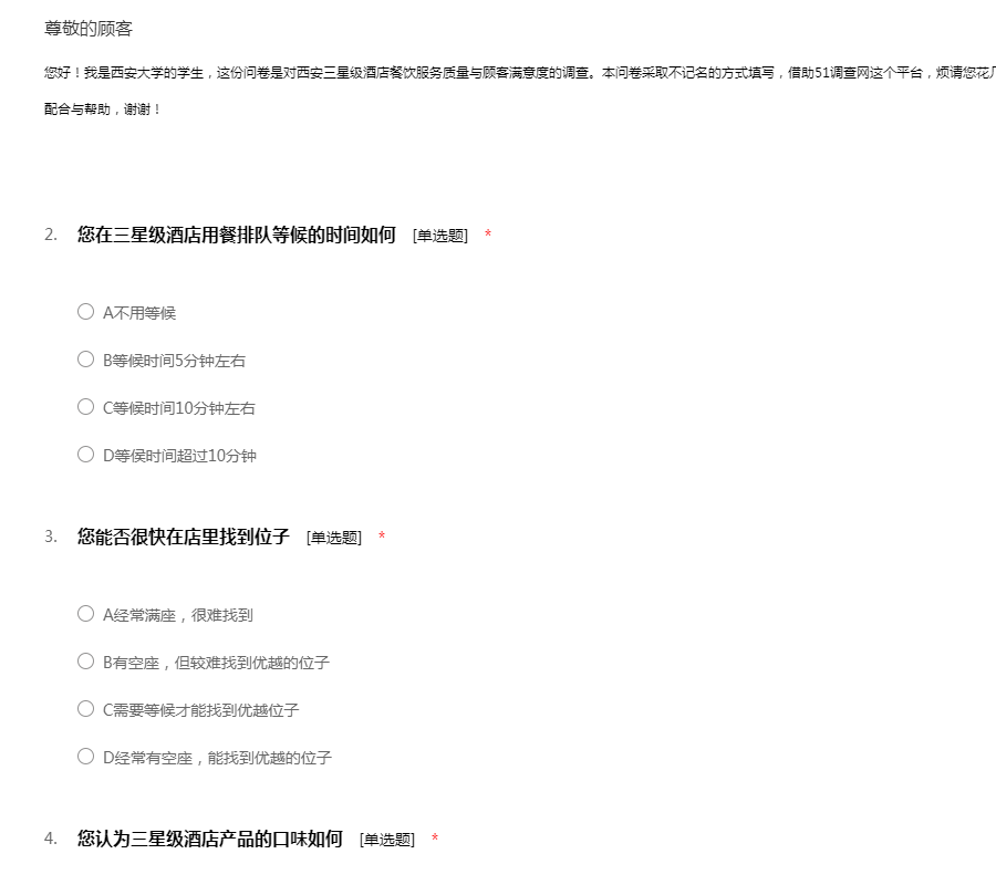 您好!我是西安大学的学生,这份问卷是对西安三星级酒店餐饮服务质量与顾客满意度的调查。本问卷采取不记名的方式填写,借助51调查网这个平台,烦请您花几分钟,按照实际情况填写问卷,非常感谢您的配合与帮助,谢谢!