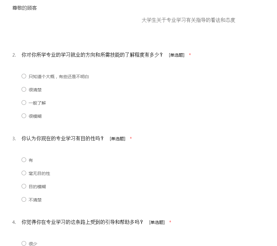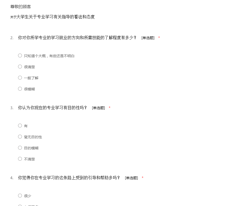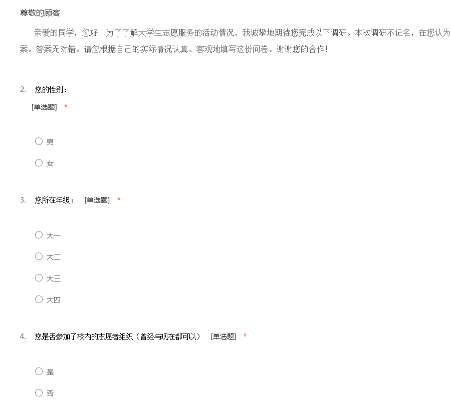 亲爱的同学,您好!为了了解大学生志愿服务的活动情况,我诚挚地期待您完成以下调研。本次调研不记名,在您认为的选项序号“○”里标出所选的答案。答案无对错。请您根据自己的实际情况认真、客观地填写这份问卷。谢谢您的合作!