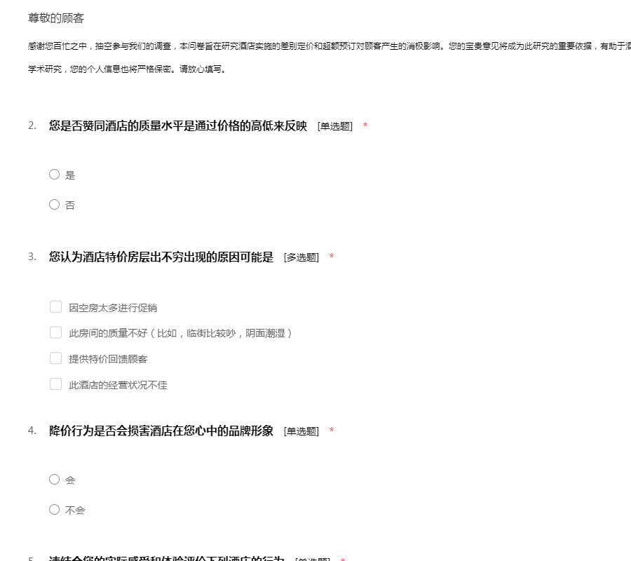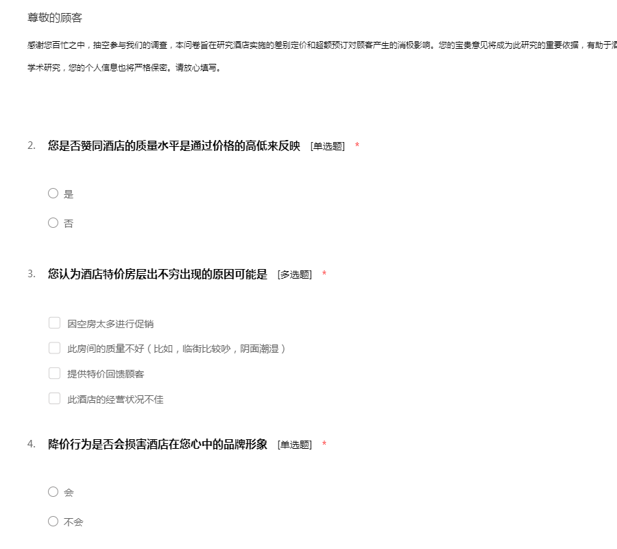 感谢您百忙之中,抽空参与我们的调查,本问卷旨在研究酒店实施的差别定价和超额预订对顾客产生的消极影响。您的宝贵意见将成为此研究的重要依据,有助于酒店为您提供更加贴心的服务。此外,本问卷仅供学术研究,您的个人信息也将严格保密。请放心填写。