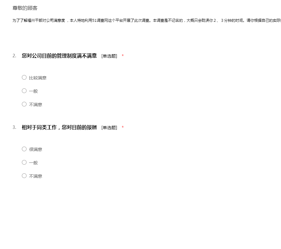 为了了解福州干部对公司满意度 ,本人特地利用51调查网这个平台开展了此次调查。本调查是不记名的,大概只会耽误你2、3分钟的时间。请你根据自己的实际情况填写。