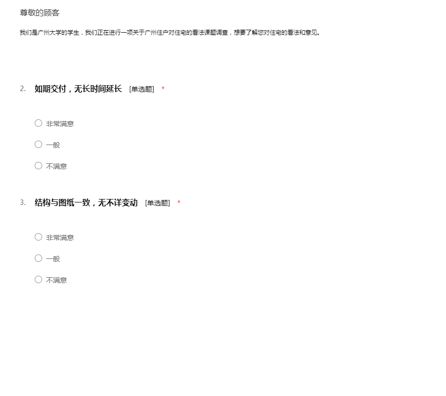 我们是广州大学的学生,我们正在进行一项关于广州住户对住宅的看法课题调查,想要了解您对住宅的看法和意见。
