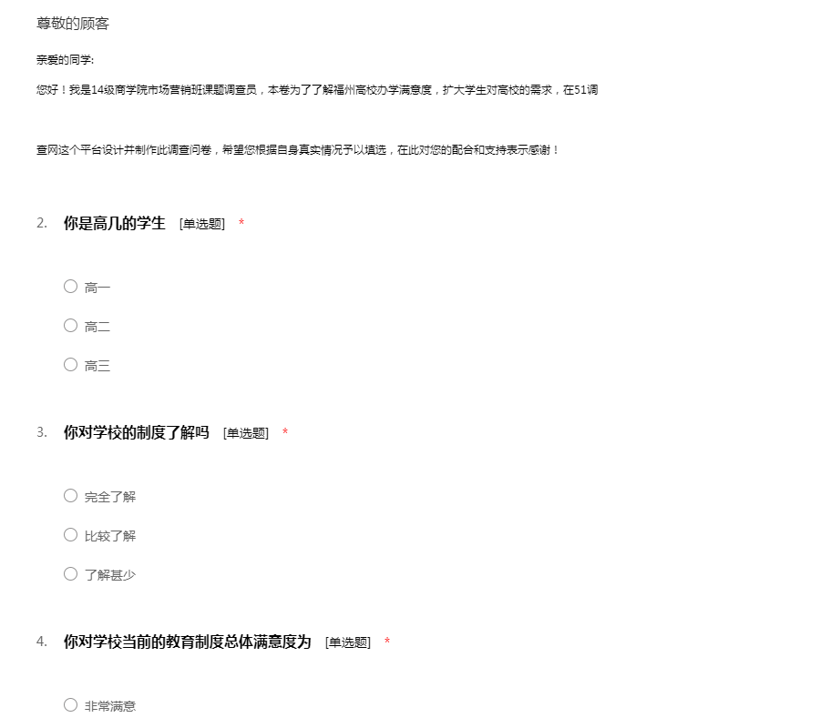 亲爱的同学: 您好!我是14级商学院市场营销班课题调查员,本卷为了了解福州高校办学满意度,扩大学生对高校的需求,在51调 查网这个平台设计并制作此调查问卷,希望您根据自身真实情况予以填选,在此对您的配合和支持表示感谢!