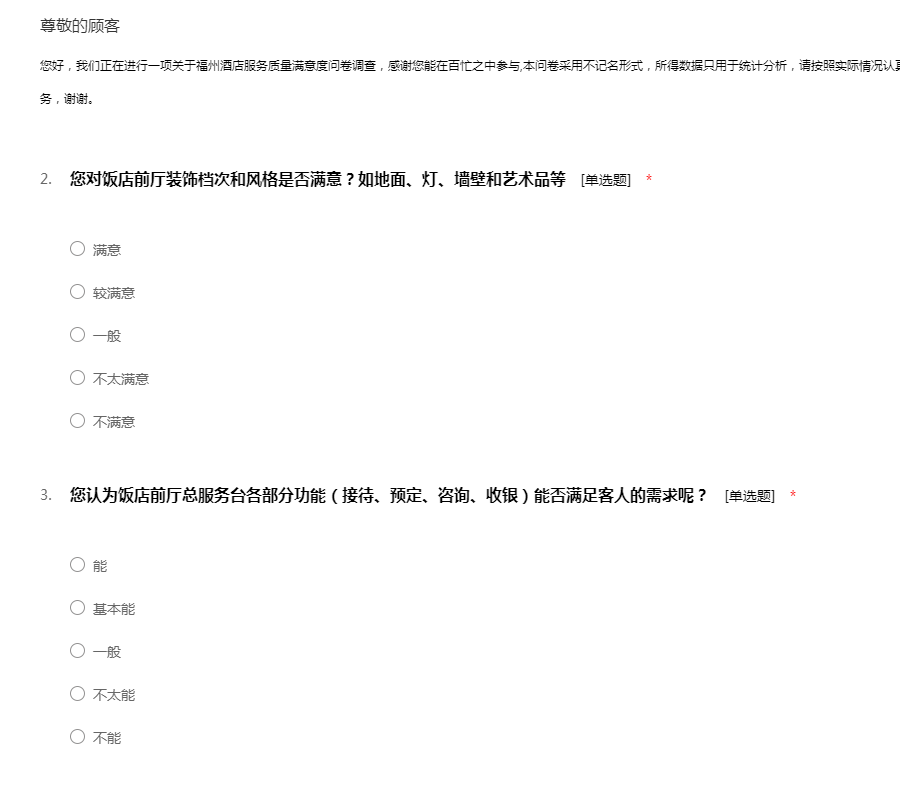 您好,我们正在进行一项关于福州酒店服务质量满意度问卷调查,感谢您能在百忙之中参与,本问卷采用不记名形式,所得数据只用于统计分析,请按照实际情况认真填写,我们会根据您的反馈来完善我们的服务,谢谢。