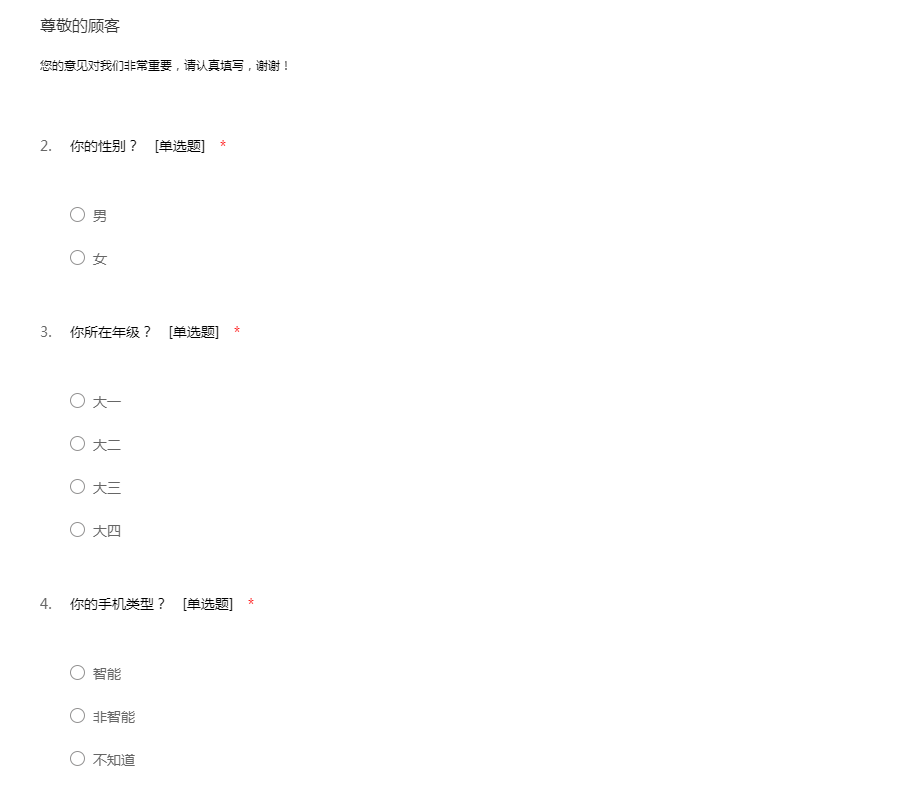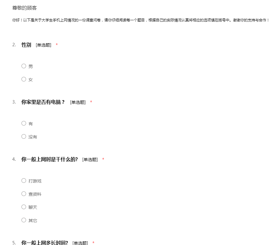 你好!以下是关于大学生手机上网情况的一份调查问卷,请你仔细阅读每一个题目,根据自己的实际情况认真将相应的选项填在括号中。谢谢你的支持与合作!
