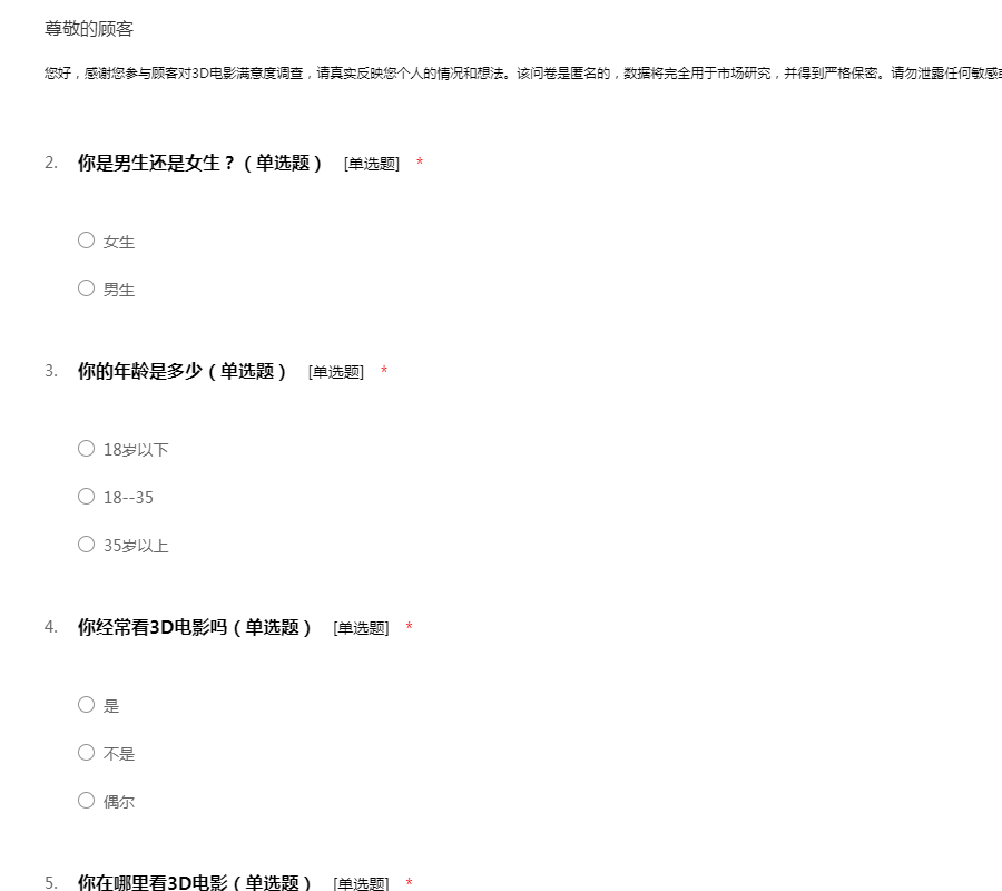您好,感谢您参与顾客对3D电影满意度调查,请真实反映您个人的情况和想法。该问卷是匿名的,数据将完全用于市场研究,并得到严格保密。请勿泄露任何敏感或机密的信息。