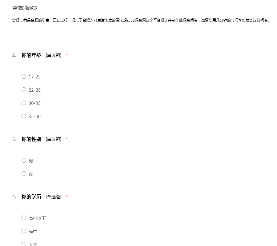 您好,我是合肥的学生,正在进行一项关于合肥人对生活态度的看法想在51调查网这个平台设计并制作此调查问卷,邀请您用几分钟的时间帮忙填答这份问卷。