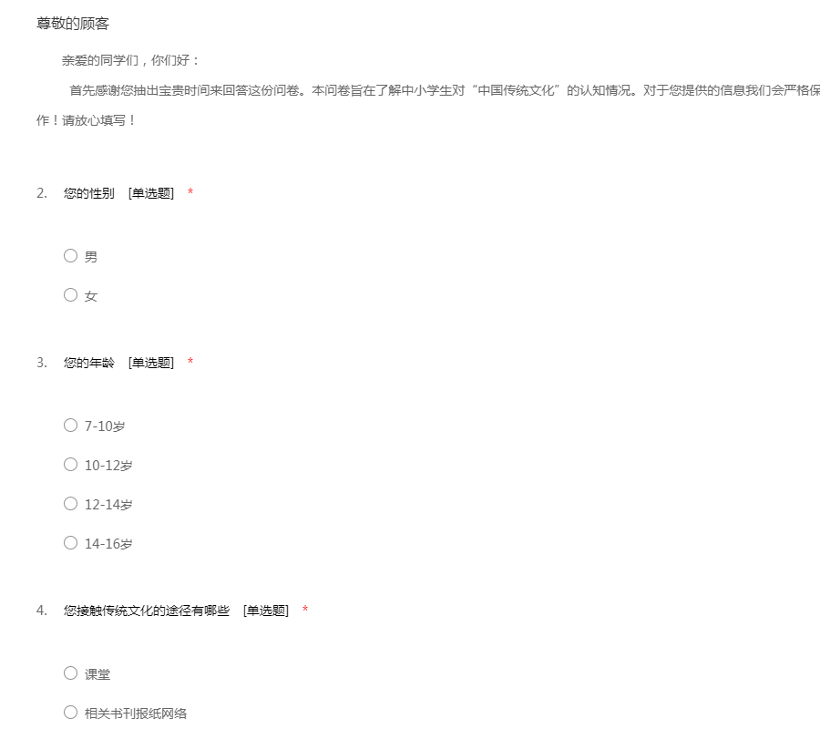 亲爱的同学们,你们好: 首先感谢您抽出宝贵时间来回答这份问卷。本问卷旨在了解中小学生对“中国传统文化”的认知情况。对于您提供的信息我们会严格保密。所有题目皆为单项选择。谢谢您的合作!请放心填写!