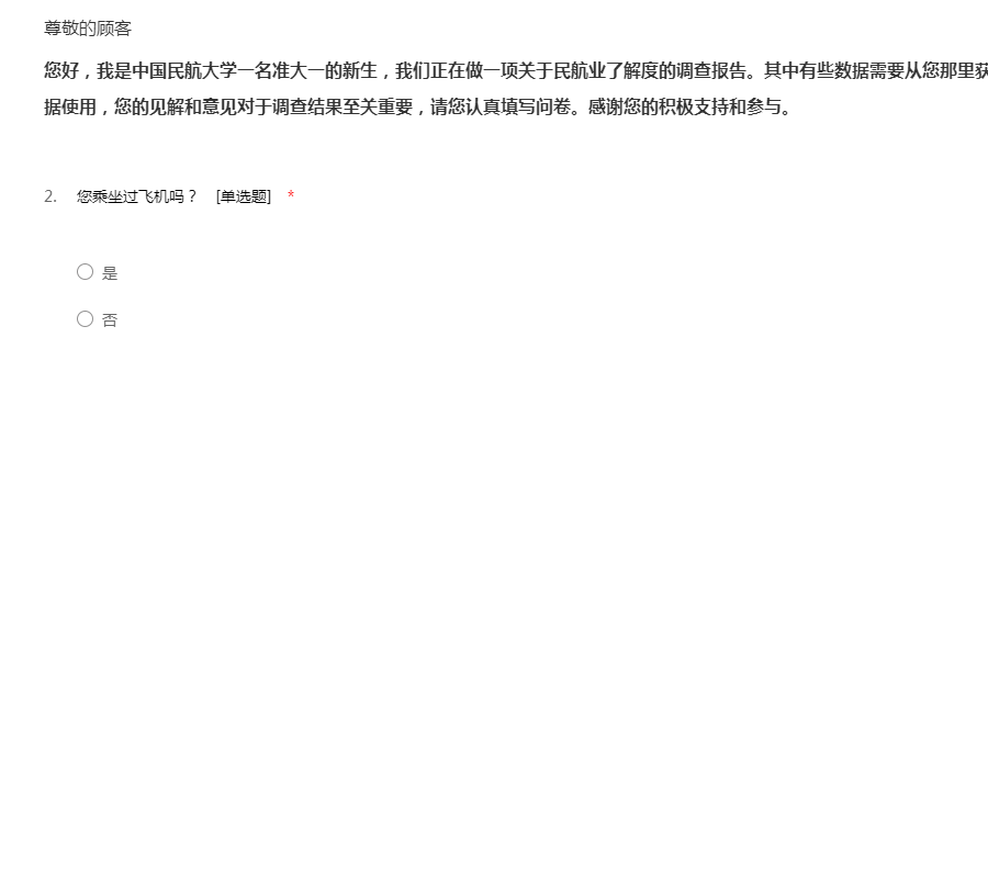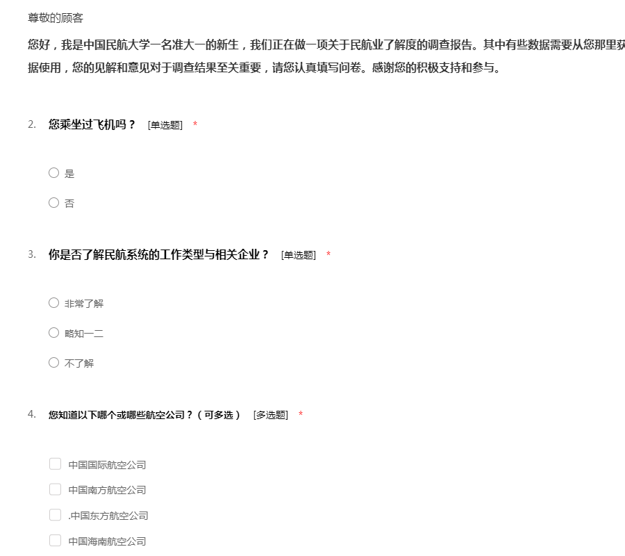 您好,我是中国民航大学一名准大一的新生,我们正在做一项关于民航业了解度的调查报告。其中有些数据需要从您那里获得,您的问卷将作为统计和建议依据使用,您的见解和意见对于调查结果至关重要,请您认真填写问卷。感谢您的积极支持和参与。