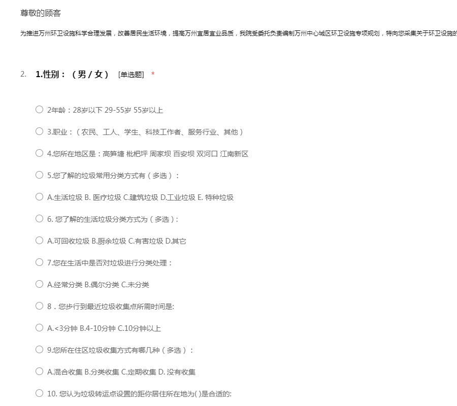 为推进万州环卫设施科学合理发展,改善居民生活环境,提高万州宜居宜业品质,我院受委托负责编制万州中心城区环卫设施专项规划,特向您采集关于环卫设施的意见。 填表日期: 年 月 日
