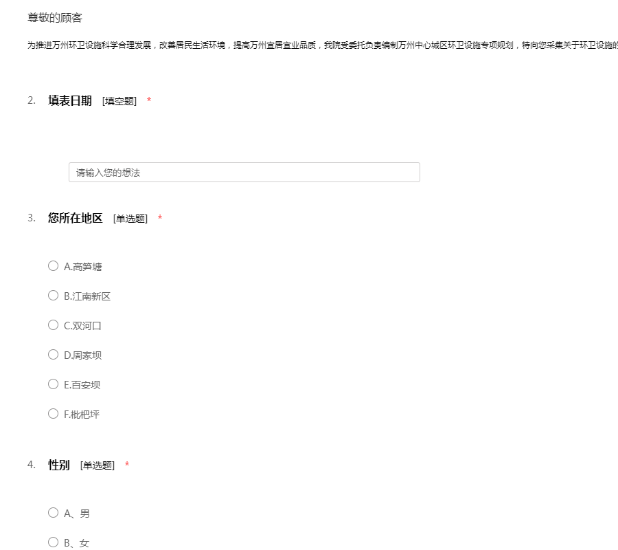为推进万州环卫设施科学合理发展,改善居民生活环境,提高万州宜居宜业品质,我院受委托负责编制万州中心城区环卫设施专项规划,特向您采集关于环卫设施的意见。