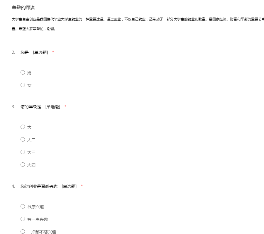 大学生自主创业是我国当代毕业大学生就业的一种重要途径。通过创业,不仅自己就业,还带动了一部分大学生的就业和致富。是国家经济、财富和平衡的重要节点。本问卷针对当代大学生的自主创业状况展开调查。希望大家帮帮忙,谢谢。