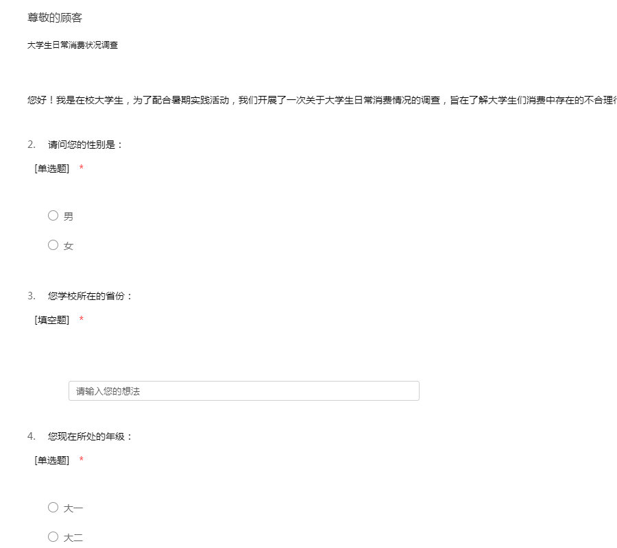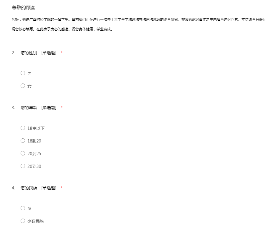 您好,我是广西财经学院的一名学生。目前我们正在进行一项关于大学生学法遵法守法用法意识的调查研究。非常感谢您百忙之中来填写这份问卷。本次调查会保证您的个人信息不被泄漏,而仅仅用于调查研究,请您放心填写。在此表示衷心的感谢。祝您身体健康,学业有成。