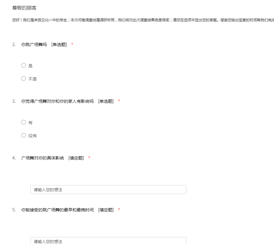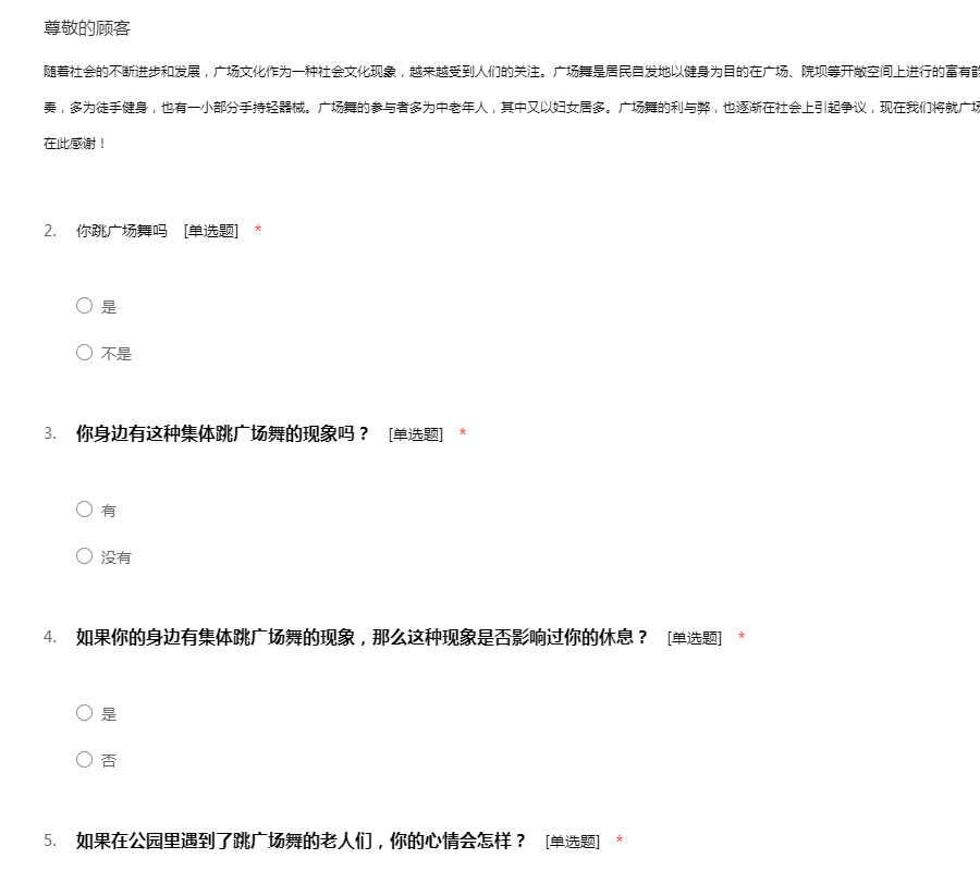随着社会的不断进步和发展,广场文化作为一种社会文化现象,越来越受到人们的关注。广场舞是居民自发地以健身为目的在广场、院坝等开敞空间上进行的富有韵律的舞蹈,通常伴有高分贝、节奏感强的音乐伴奏,多为徒手健身,也有一小部分手持轻器械。广场舞的参与者多为中老年人,其中又以妇女居多。广场舞的利与弊,也逐渐在社会上引起争议,现在我们将就广场舞的利与弊做以下问卷,麻烦大家帮忙做一下,在此感谢!