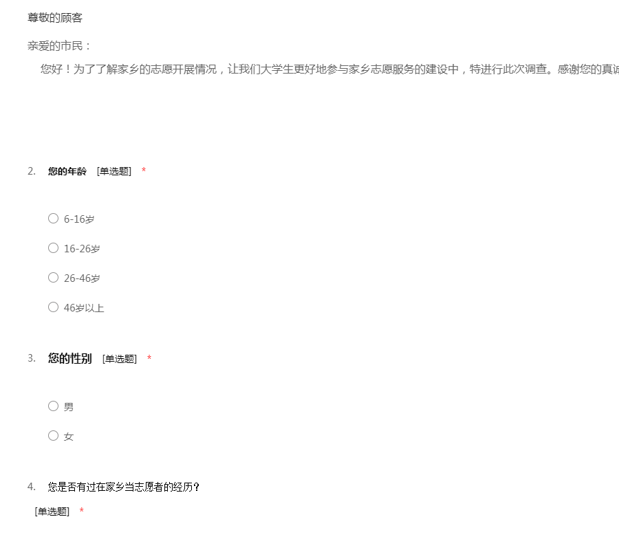 亲爱的市民: 您好!为了了解家乡的志愿开展情况,让我们大学生更好地参与家乡志愿服务的建设中,特进行此次调查。感谢您的真诚合作! 华东理工大学材化141志愿小分队 2015年8月