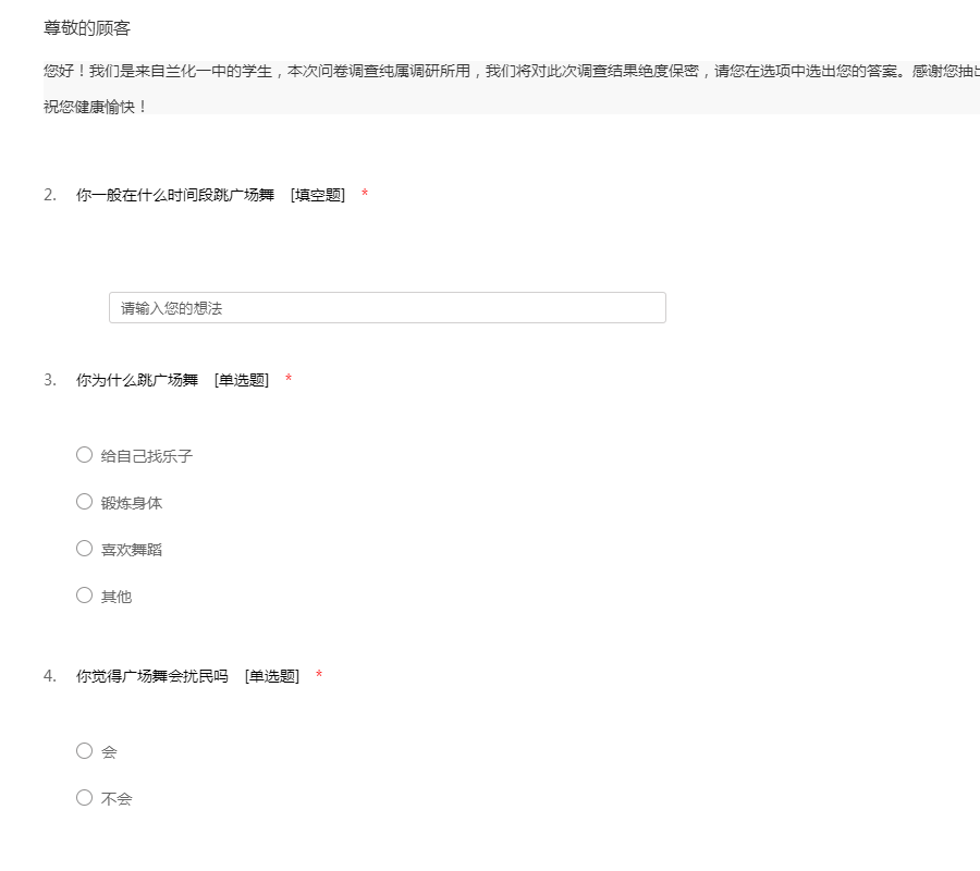 您好!我们是来自兰化一中的学生,本次问卷调查纯属调研所用,我们将对此次调查结果绝度保密,请您在选项中选出您的答案。感谢您抽出宝贵的时间帮我们完成这份问卷调查,祝您健康愉快!
