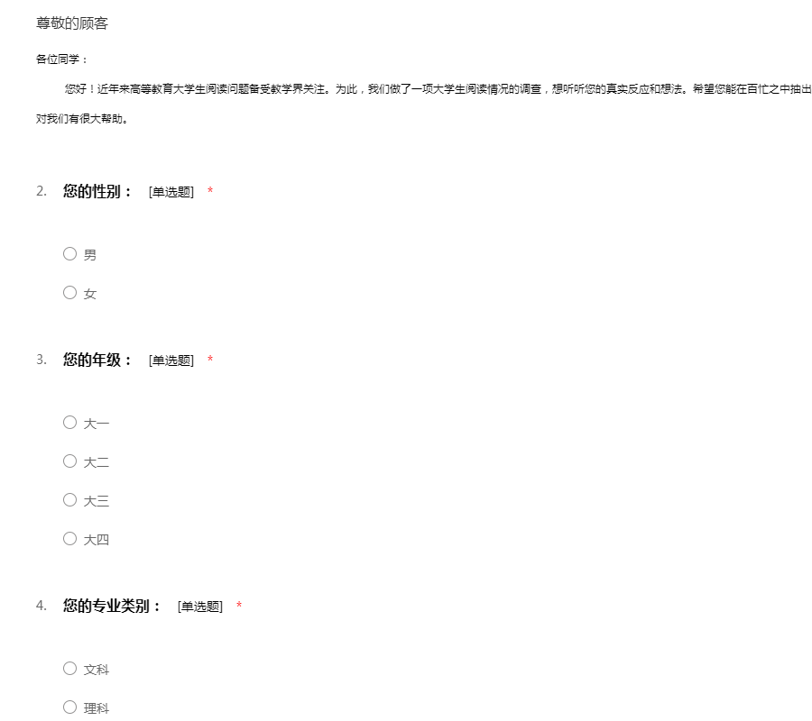 各位同学: 您好!近年来高等教育大学生阅读问题备受教学界关注。为此,我们做了一项大学生阅读情况的调查,想听听您的真实反应和想法。希望您能在百忙之中抽出一点时间协助我们完成这项调查,您的意见将会对我们有很大帮助。