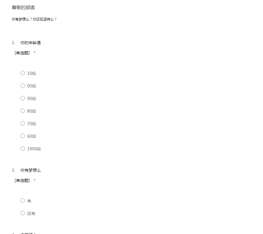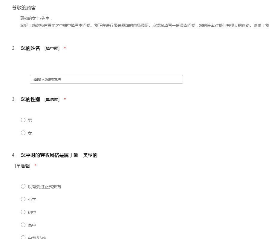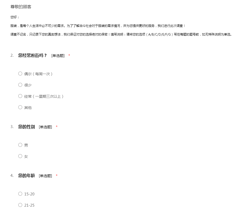 尊敬的女士/先生: 您好!感谢您在百忙之中抽空填写本问卷。我正在进行服装品牌的市场调研。麻烦您填写一份调查问卷,您的答案对我们有很大的帮助。谢谢!我们将会对您的信息保密。