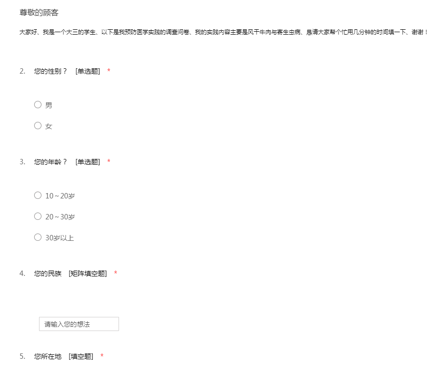 大家好、我是一个大三的学生、以下是我预防医学实践的调查问卷、我的实践内容主要是风干牛肉与寄生虫病、恳请大家帮个忙用几分钟的时间填一下、谢谢!