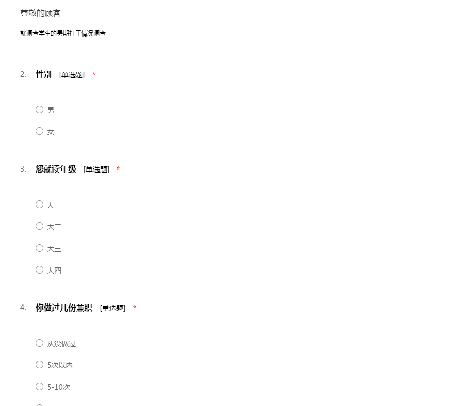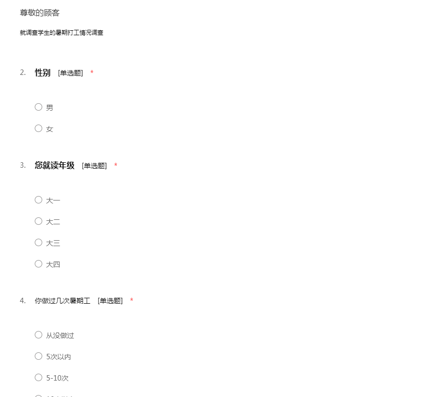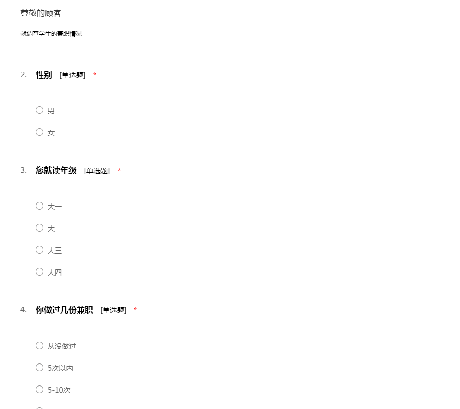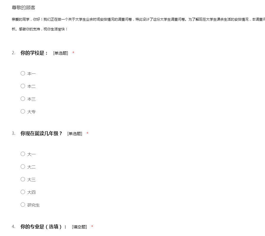 亲爱的同学,你好!我们正在做一个关于大学生业余时间安排情况的调查问卷,特此设计了这份大学生调查问卷。为了解现在大学生课余生活的安排情况,本调查问卷不记名。你的数据我们不会泄漏,仅做统计分析。感谢你的支持,祝你生活愉快!