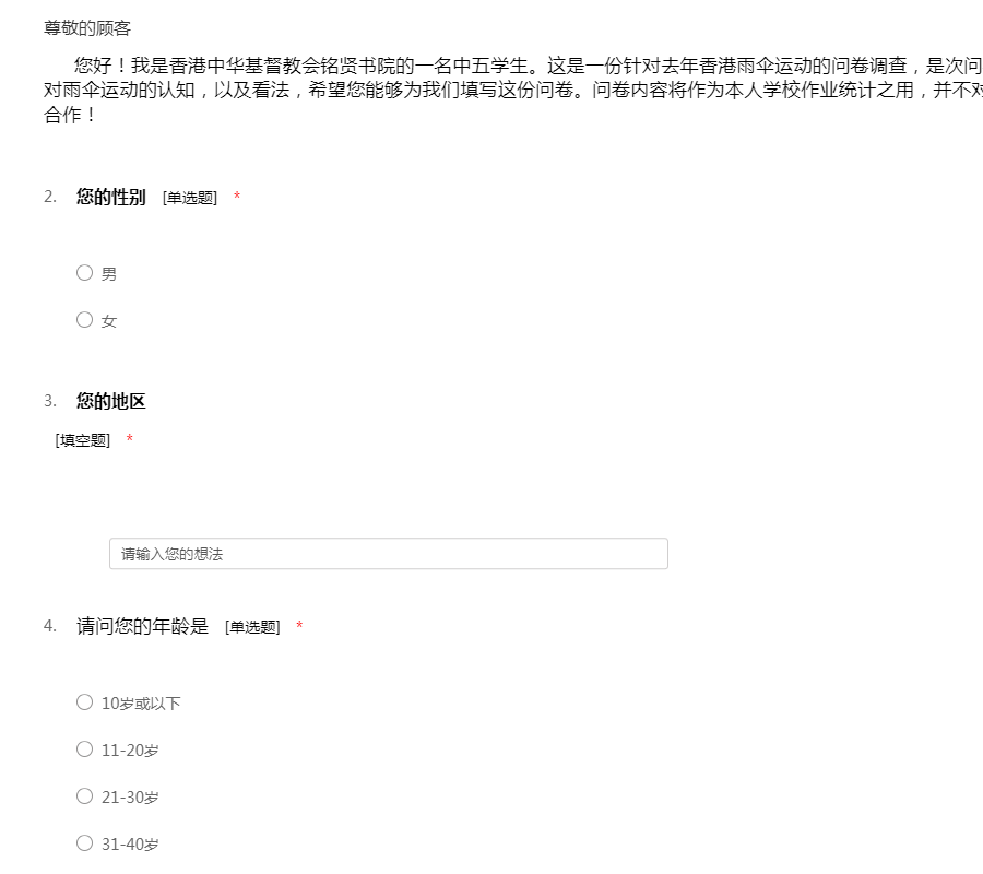您好!我是香港中华基督教会铭贤书院的一名中五学生。这是一份针对去年香港雨伞运动的问卷调查,是次问卷是为了更能清楚了解国内人民对雨伞运动的认知,以及看法,希望您能够为我们填写这份问卷。问卷内容将作为本人学校作业统计之用,并不对外公布,请安心作答。谢谢您的合作!