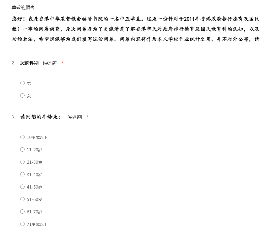 您好!我是香港中华基督教会铭贤书院的一名中五学生。这是一份针对于2011年香港政府推行德育及国民教育科(简称国民教育、国教)一事的问卷调查,是次问卷是为了更能清楚了解香港市民对政府推行德育及国民教育科的认知,以及对因此而引发的一连串社会活动的看法,希望您能够为我们填写这份问卷。问卷内容将作为本人学校作业统计之用,并不对外公布,请安心作答。谢谢您的合作!