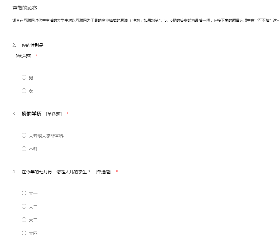 调查在互联网时代中生活的大学生对以互联网为工具的商业模式的看法 (注意:如果您第4、5、6题的答案都为最后一项,在接下来的题目选项中有“可不填”这一项,请选上,谢谢您的配合,祝您生活愉快!)