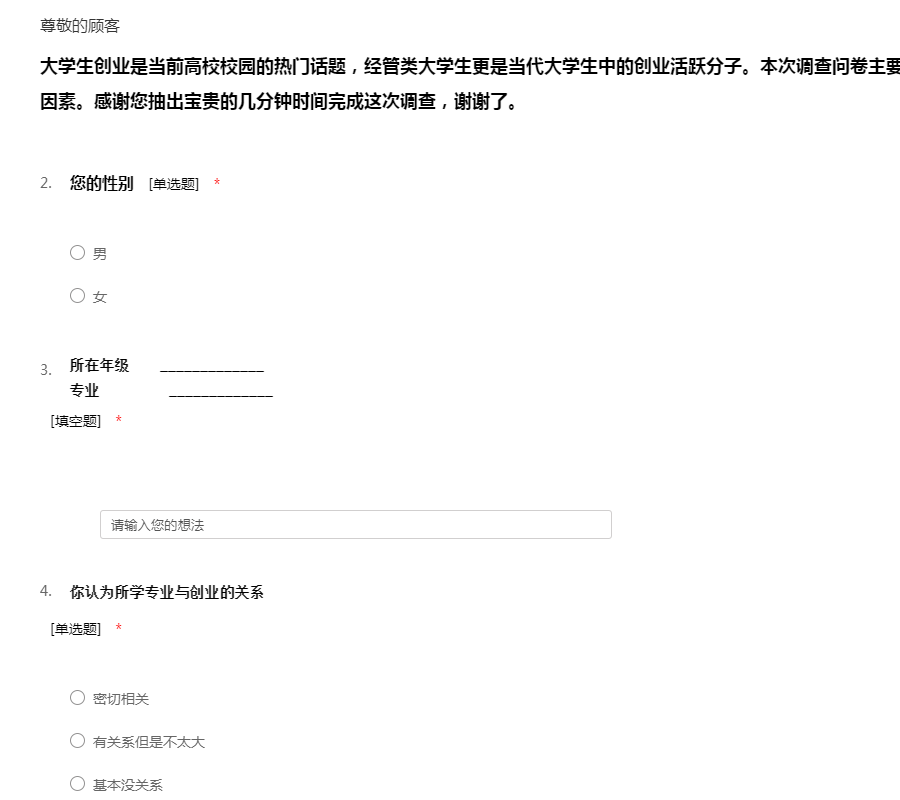 大学生创业是当前高校校园的热门话题,经管类大学生更是当代大学生中的创业活跃分子。本次调查问卷主要是想了解经管大学生的创业影响因素。感谢您抽出宝贵的几分钟时间完成这次调查,谢谢了。