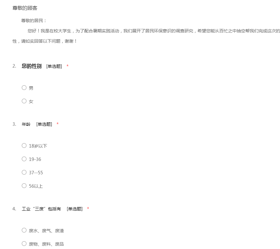 尊敬的居民: 您好!我是在校大学生,为了配合暑期实践活动,我们展开了居民环保意识的调查研究,希望您能从百忙之中抽空帮我们完成这次的调查问卷,为了保证该问卷结果的准确性,请如实回答以下问题,谢谢!