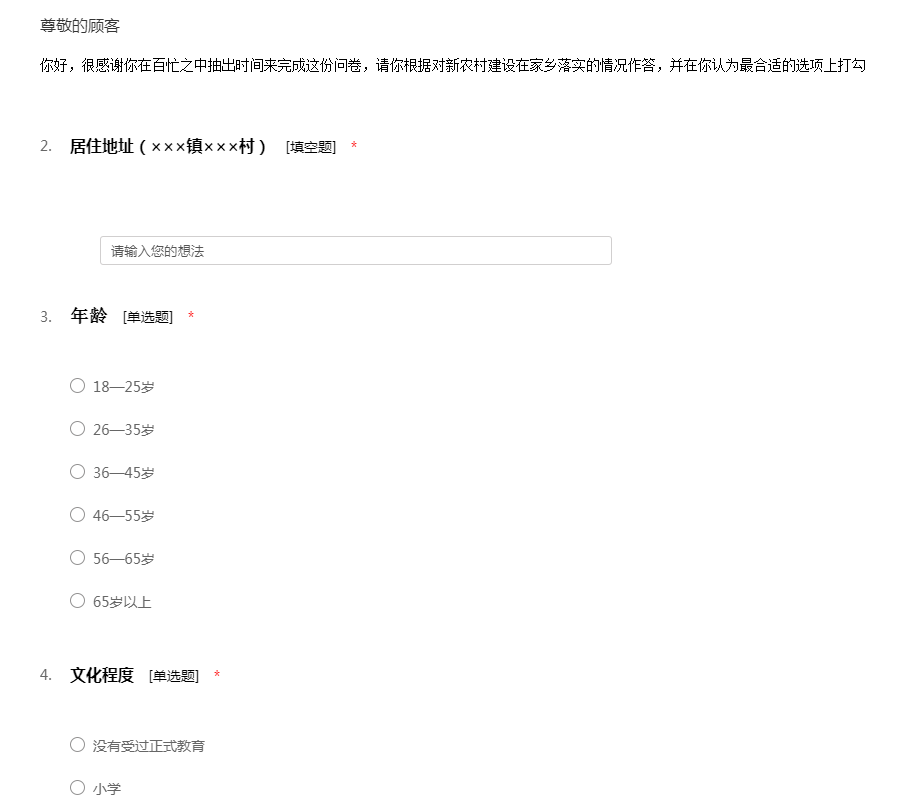 你好,很感谢你在百忙之中抽出时间来完成这份问卷,请你根据对新农村建设在家乡落实的情况作答,并在你认为最合适的选项上打勾