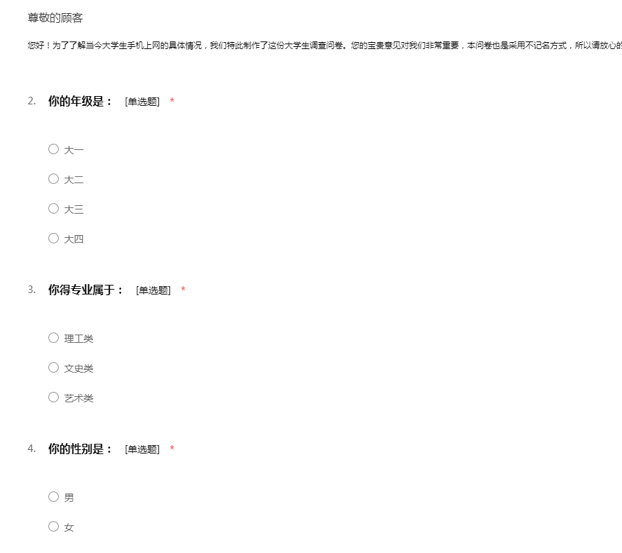 您好!为了了解当今大学生手机上网的具体情况,我们特此制作了这份大学生调查问卷。您的宝贵意见对我们非常重要,本问卷也是采用不记名方式,所以请放心的如实填写。感谢您的支持与配合!