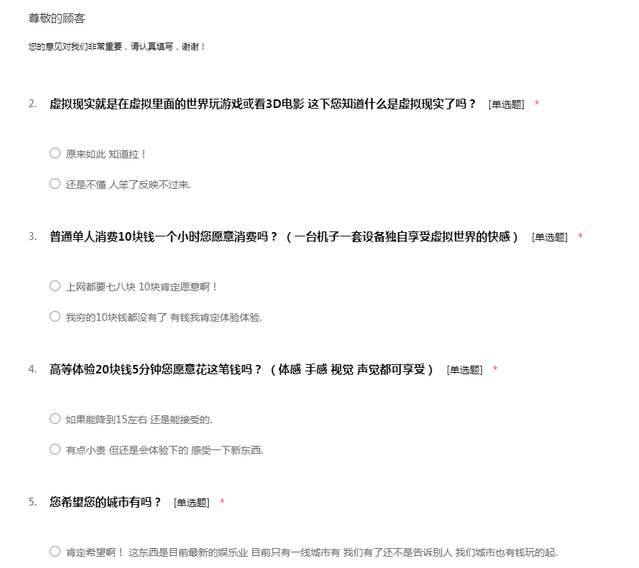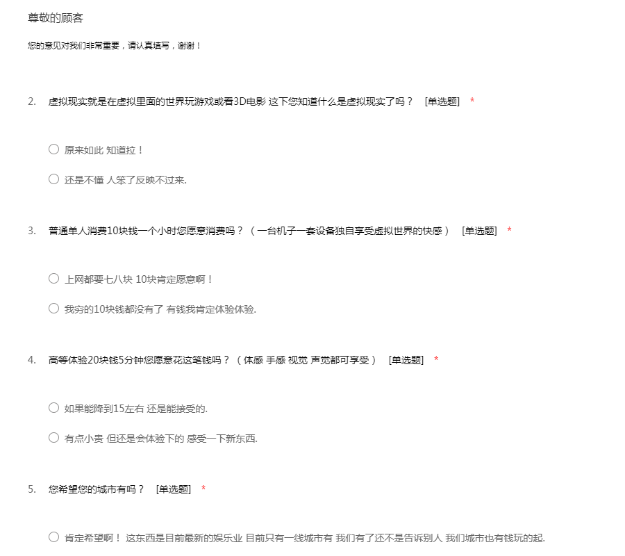 虚拟现实体验馆 武汉和仙桃 市民调查表