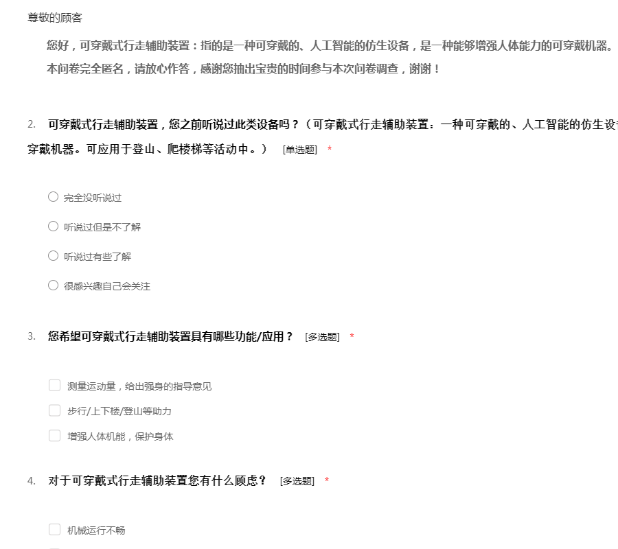 您好,可穿戴式行走辅助装置:指的是一种可穿戴的、人工智能的仿生设备,是一种能够增强人体能力的可穿戴机器。可应用于登山、爬楼梯等活动中。 本问卷完全匿名,请放心作答,感谢您抽出宝贵的时间参与本次问卷调查,谢谢!