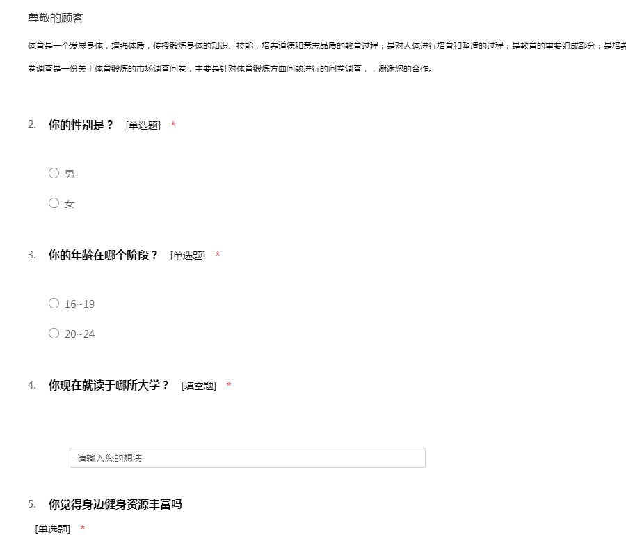 体育是一个发展身体,增强体质,传授锻炼身体的知识、技能,培养道德和意志品质的教育过程;是对人体进行培育和塑造的过程;是教育的重要组成部分;是培养全面发展的人的一个重要方面。关于体育锻炼问卷调查是一份关于体育锻炼的市场调查问卷,主要是针对体育锻炼方面问题进行的问卷调查,,谢谢您的合作。