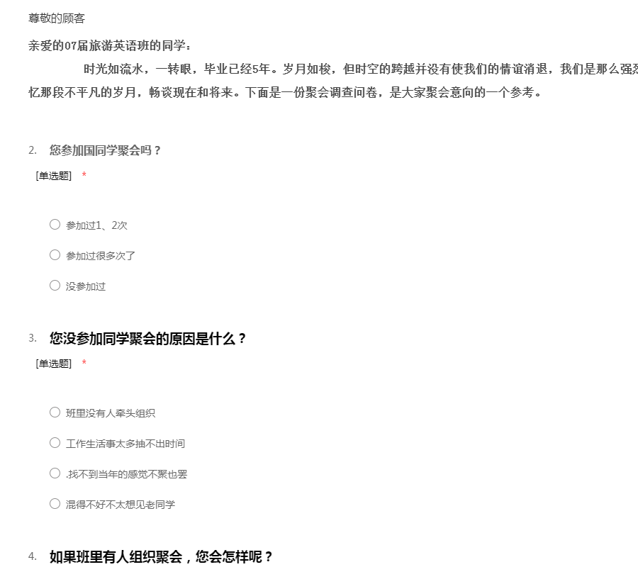 亲爱的07届旅游英语班的同学: 时光如流水,一转眼,毕业已经5年。岁月如梭,但时空的跨越并没有使我们的情谊消退,我们是那么强烈地期盼着老同学的聚首!一起回忆那段不平凡的岁月,畅谈现在和将来。下面是一份聚会调查问卷,是大家聚会意向的一个参考。