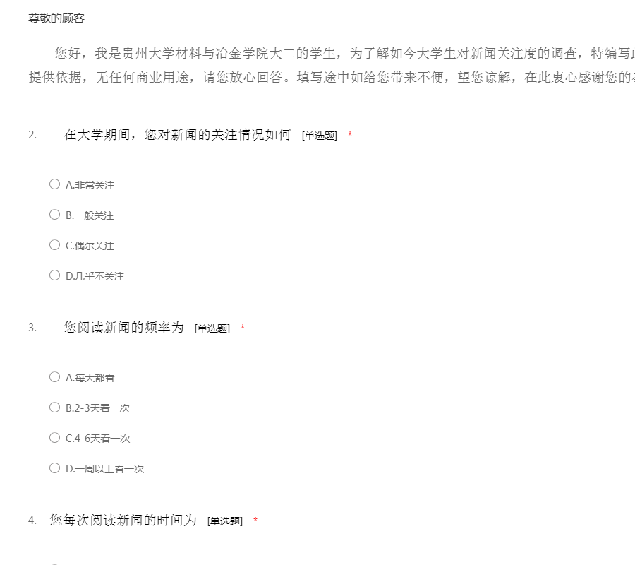 您好,我是贵州大学材料与冶金学院大二的学生,为了解如今大学生对新闻关注度的调查,特编写此问卷,本问卷只为数据分析提供依据,无任何商业用途,请您放心回答。填写途中如给您带来不便,望您谅解,在此衷心感谢您的参与和支持!