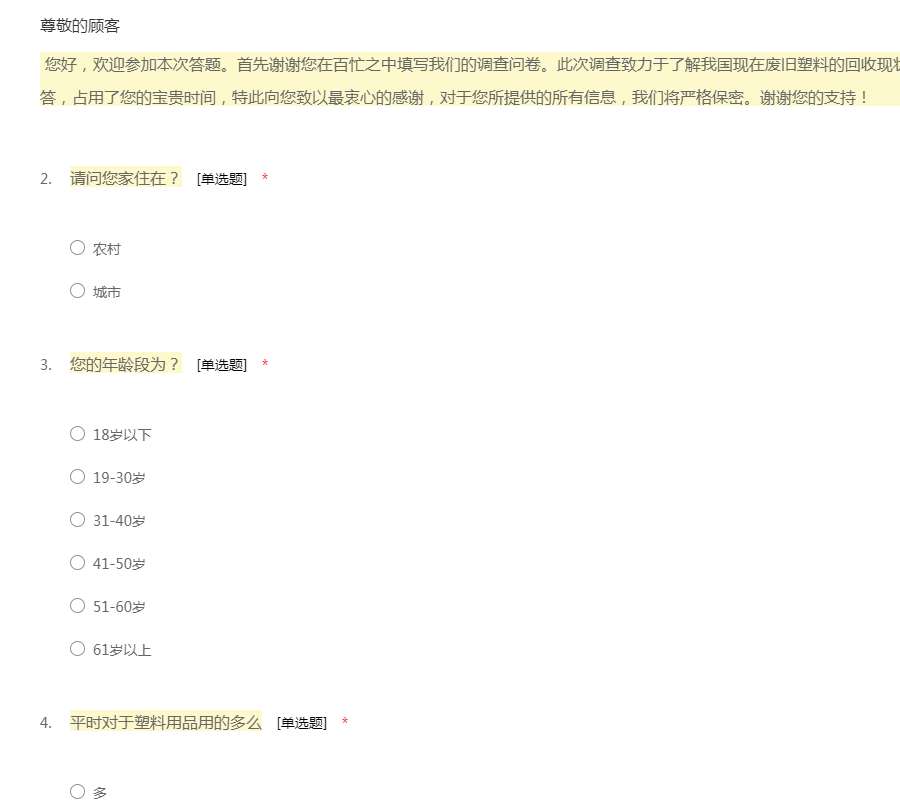 您好,欢迎参加本次答题。首先谢谢您在百忙之中填写我们的调查问卷。此次调查致力于了解我国现在废旧塑料的回收现状及找到处理办法。请您视情况作答,占用了您的宝贵时间,特此向您致以最衷心的感谢,对于您所提供的所有信息,我们将严格保密。谢谢您的支持!