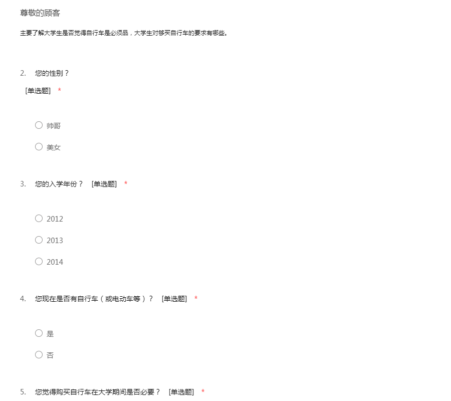 主要了解大学生是否觉得自行车是必须品,大学生对够买自行车的要求有哪些。