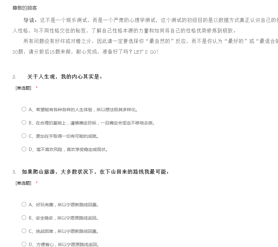 导读:这不是一个娱乐测试,而是一个严肃的心理学测试,这个测试的初级目的是以数据方式真正认识自己的性格特点。高级目的是准确识别他人性格,与不同性格交往的秘笈,了解自己性格本源的力量和如何将自己的性格优势修炼到极致。 所有问题没有好坏或对错之分,因此请一定要选择你“最自然的”反应,而不是你认为“最好的”或“最适合的”。最后说一句,题目略长,共30题,请分前后15题来做,耐心完成,准备好了吗?LET'S GO!