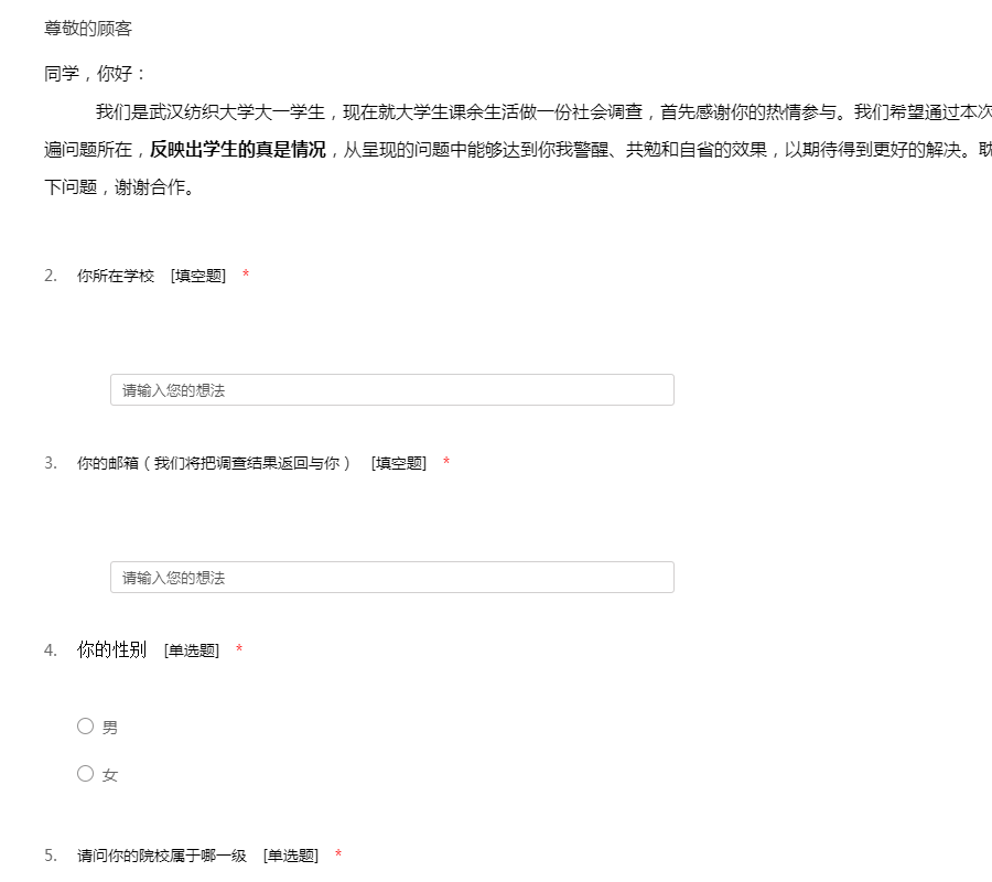 同学,你好: 我们是武汉纺织大学大一学生,现在就大学生课余生活做一份社会调查,首先感谢你的热情参与。我们希望通过本次调查能够发现当代大学生存在的普遍问题所在,反映出学生的真是情况,从呈现的问题中能够达到你我警醒、共勉和自省的效果,以期待得到更好的解决。耽误大家几分钟时间,请帮忙填写以下问题,谢谢合作。