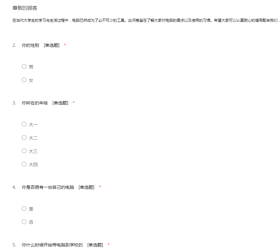 在当代大学生的学习与生活过程中,电脑已然成为了必不可少的工具。此问卷旨在了解大家对电脑的需求以及使用的习惯。希望大家可以认真耐心的填写配合我们,谢谢大家。